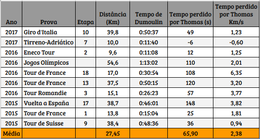 A média de perda por quilómetro de Thomas para Dumoulin são 2,38 segundos.